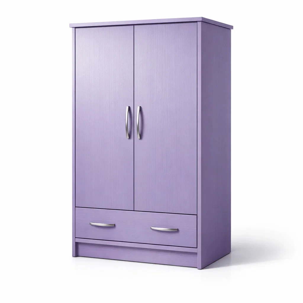 Dieser Kleiderschrank besteht aus MDF-Platten mit zwei Türen und einer Schublade. Die Abmessungen betragen 80 x 50 x 180 cm. Der Schrank ist in Lavendelfarbe gestaltet und besitzt Aluminiumgriffe an den Türen und der Schublade.