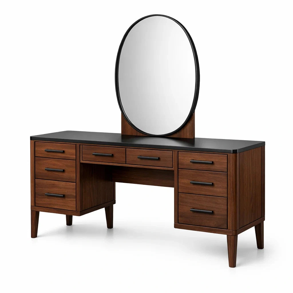 Materialien: MDF mit Walnussfurnier, Spiegelglas